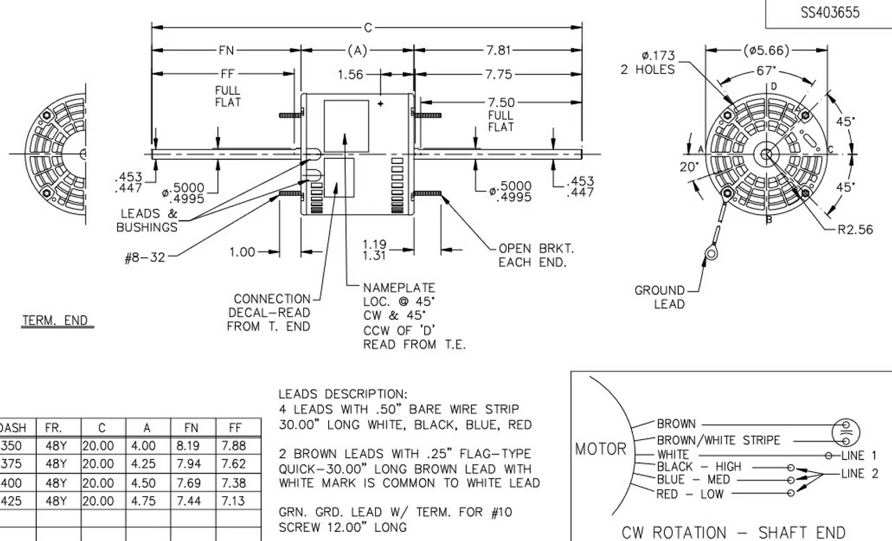 - No Base, CCW rotation lead end, Ball Bearings, Class B insulation
