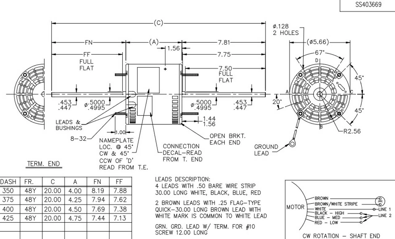 - No Base, CCW rotation lead end, Ball Bearings, Class B insulation